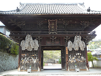 | 西國寺の仁王門です。約2メートルの巨大な草履が目印。 足腰にご利益があるとかで、歩きの旅なら立ち寄るべし…と思ったのですが、ここまで来るだけで健脚になりそうなアップダウンでした。(笑) しかも、この門の奥の階段がまた結構な段数で…。日頃の運動不足が祟って、ぜーはー言いながら昇る羽目に。 |